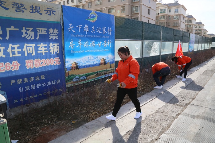 3月5日上午,雄关段组织青年志愿者前往嘉峪关市高速收费入口处,清扫路面抛洒物及收费口两侧灌木丛中的烟头、纸屑、饮料瓶等。