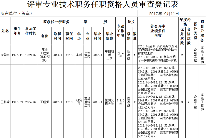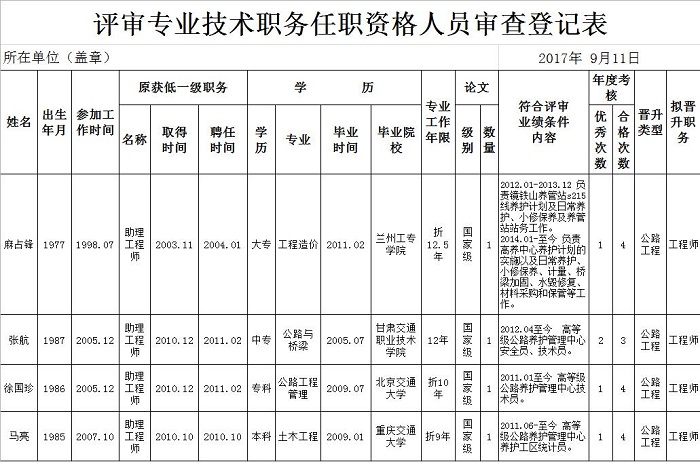 根据省交通运输厅《关于报送2017年交通运输工程高级专业技术职务任职资格评审材料的通知》(甘交人劳〔2017〕64号)和《关于报送2017年经济、会计等系列专业技术职务任职资格评审材料有关问题的通知》(甘交人劳〔2017〕65号)精神,经嘉峪关公路管理局2017年9月18日局务会研究,同意殷华甲、王林峰同志申报副高级专业技术职务任职资格,同意麻占锋、张航、徐国珍、马亮同志申报中级专业技术职务任职资格。现进行公示,如有异议,请于2017年9月18日-9月22日向局纪委(监察室)、人事劳资科反映。